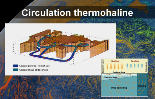 La circulation thermohaline (“thermo” = température, “haline” = salinité) est la circulation globale des eaux profondes des océans engendrée par la différence de densité de l’eau.