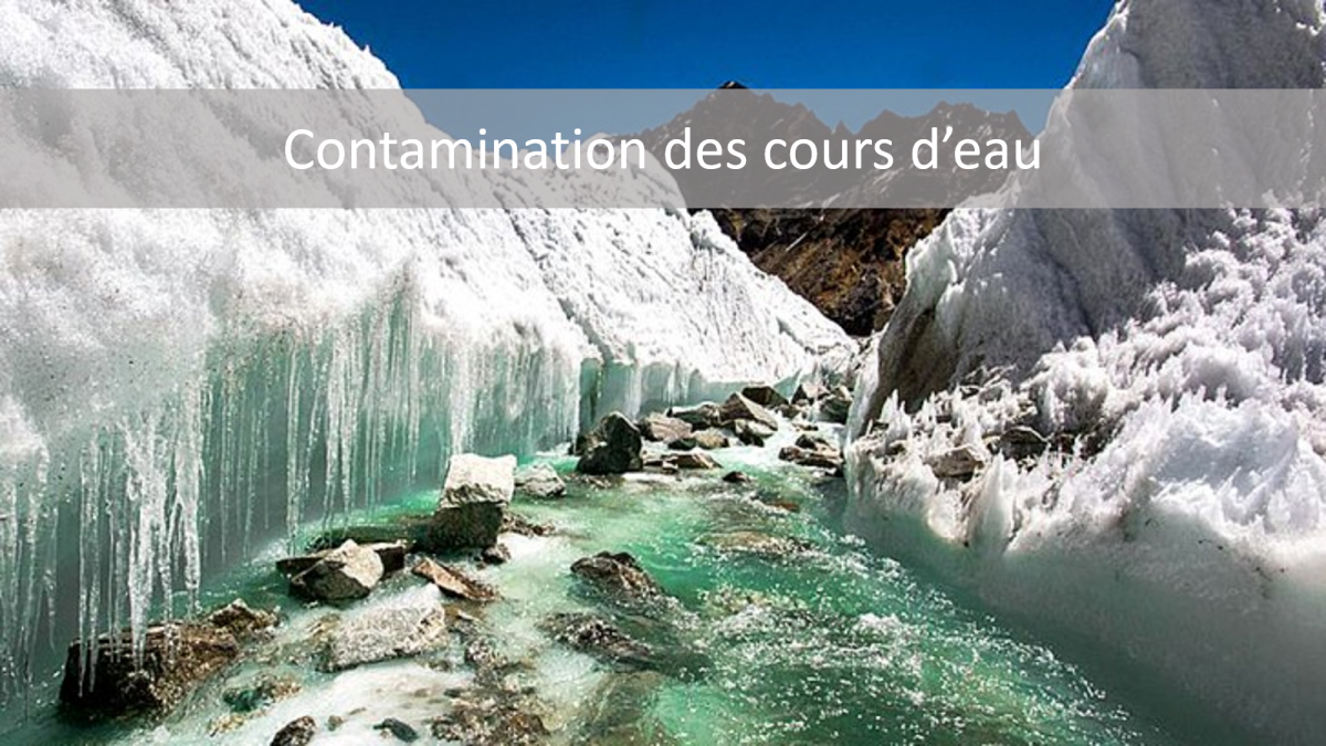 Le déclin des glaciers peut influencer la qualité de l'eau en accélérant le rejet des polluants d'origine anthropique stockés, avec des impacts sur les services écosystémiques en aval. Ces polluants hérités comprennent notamment les polluants organiques persistants (POP), en particulier les biphényles polychlorés (PCB) et le dichlorodiphényl-trichloroéthane (DDT), les hydrocarbures aromatiques polycycliques et les métaux lourds (Hodson, 2014) et sont associés au dépôt et à la libération de carbone noir