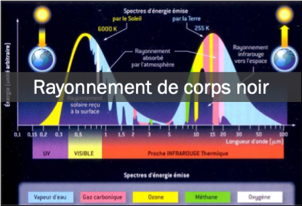 Le Soleil (6000 °K) émet dans le spectre visible. La Terre (288 °K) émet dans l'infrarouge.