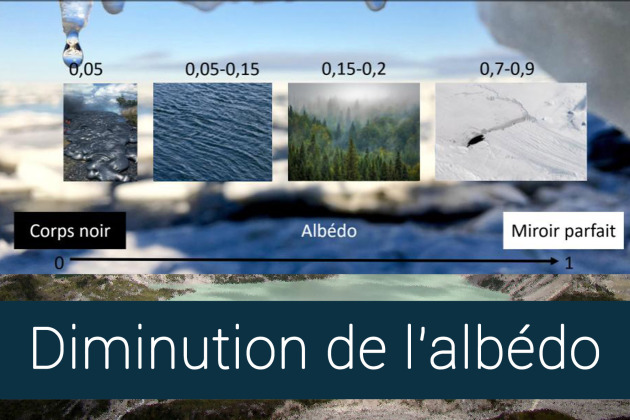 L’albédo est la fraction de lumière que réfléchi ou diffuse un corps non lumineux. La fonte des glaces entraîne la diminution de la surface occupée sur la Terre par de la glace (surface blanche avec une albédo élevée). Une fois fondue cette surface est remplacée par de la terre puis de la végétation ou bien par de l’eau liquide. Dans les deux cas l’albédo diminue et donc plus de rayonnements sont absorbés par la Terre. Cela a pour principale conséquence la hausse de la température terrestre. Cette hausse participe à la fonte des glaces et etc. C’est un cercle vicieux.