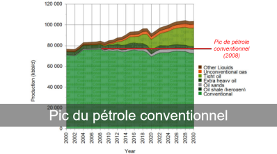 Le Pic du pétrole conventionnel (qui représente 75% du pétrole mondial) a été passé en 2008 et L’AIE (Agence Internationale de l'Énergie) n’attend pas un déplacement du pic dans le futur.
