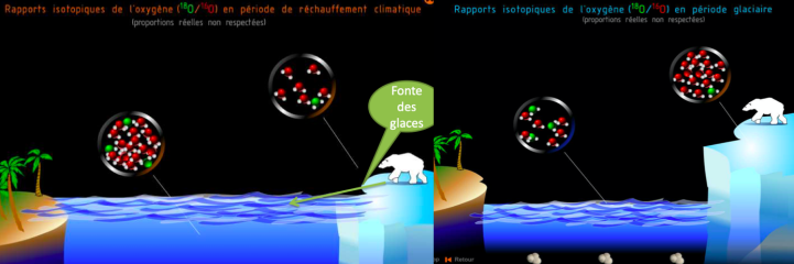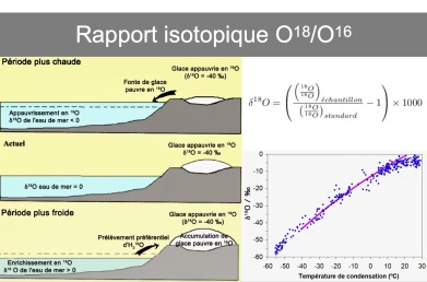 Les deux isotopes n’ont pas la même masse (2 neutrons supplémentaires pour O18) et s’évaporent donc à différentes températures. L’eau contenant l’isotope 16 (plus léger) s’évapore plus vite et ainsi l’eau atmosphérique, l’eau des précipitations et enfin la glace sont appauvries en isotope 18 (plus lourd). Ainsi, le rapport isotopique δ18O des glaces renseignent sur la température qu’il fait aux pôles : lorsque la température augmente, le δ18O augmente. De même, le ratio d’oxygène des foraminifères benthiques renseigne sur la quantité de glace stockée aux pôles : lorsque le ratio δ18O augmente, cela signifie qu’il y a plus de glace aux pôles (car elle stocke l’isotope léger) et donc qu’il fait plus froid. Et au contraire, en période chaude, la glace fond et restitue l’O16 aux océans : l’eau de mer s’appauvrit relativement en O18. On retrouve cette variation de la teneur en O18 dans les tests de foraminifères.