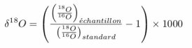 L’indicateur paléoclimatique δ18O est une mesure de la quantité d’oxygène 18 par rapport à la quantité d’oxygène 16. Ce standard fait office de référent universel et est calculé à partir de la formule :