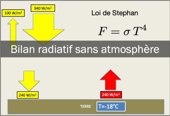 En l'absence d'atmosphère, la température de la Terre serait T=255°K en vertu de la loi de Stephan qui s'applique aux corps noirs.
