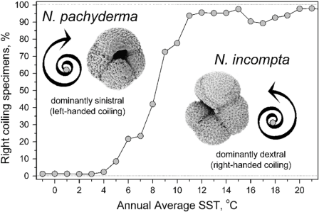 La détermination des paléotempératures océaniques (SST : Sea Surface Temperature) permet une meilleure compréhension des interactions océans-atmosphère (échanges thermiques et évaporation) et de la circulation thermohaline du passé. Ainsi, les alcénones (molécules à longue chaîne carbonée) fabriquées par le plancton marin (foraminifères, coccolithophoridés, etc.) sont très utilisées pour déterminer chimiquement la SST selon le nombre de doubles liaisons de la molécule. De même, l’espèce Neogloboquadrina pachyderma (foraminifères planctoniques fossiles) présente en surface des océans est répartie en deux variétés selon la température des eaux. La variété sénestre (ou N.pachy left) caractéristique des eaux polaires présente un enroulement à gauche tandis que la variété dextre (ou N.pachy right) préférant les eaux chaudes présente un enroulement vers la droite. Ces sédiments marins représentent donc de précieux proxies pour la température de surface des océans selon leur répartition dans les carottes de forage océanique.