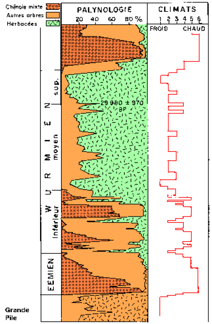 De même, les sédiments continentaux peuvent contenir des restes de plantes et en particulier des grains de pollen (assemblages polliniques) qui représentent des archives des paléoclimats (températures et précipitations) au cours du dernier cycle climatique et de l’Holocène. Par exemple, les grains de pollen du Chêne indiquent la présence de forêt et ceux du Ciste indiquent une flore méditerranéenne. En France, les assemblages polliniques de la carotte de la Grande Pile dans le Jura ont permis de reconstituer les variations de température depuis -130 000 ans.