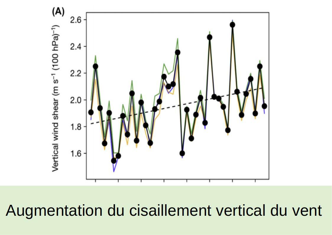Ainsi, la forme verticale des courants-jets subpolaires est modifiée par le changement climatique d'une manière non triviale. Les profils verticaux affichent un cisaillement plus faible dans la basse troposphère, mais cisaillement plus fort plus haut. Ces changements ont d'abord été projetés par des études de modèles climatiques, mais sont désormais clairement visibles dans les données d'observation historiques. Les changements sont également cohérents avec notre compréhension dynamique de l'atmosphère à grande échelle, en termes de vent thermique équilibre.