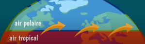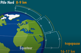 Cependant, en raison de la force de Coriolis \(F_{Coriolis} = -2m \vec{\Omega} \wedge \vec{v}\), ce mouvement d'air va être dévié vers l'est : c'est la formation d'un jet-stream.