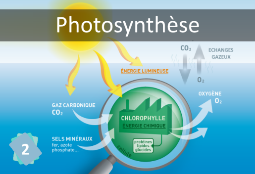 Comme toute plante terrestre, le phytoplancton, qui est un organisme végétal, capte du dioxyde de carbone et le transforme grâce à la lumière du soleil en dioxygène, selon l'équation :