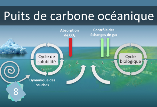 La captation du carbone par les océans se fait par deux processus de pompage. Le premier est biologique, qui repose sur le passage du carbone atmosphérique par la chaîne alimentaire et la séquestration d'une petite fraction aux fonds des océans. C'est lui qui est responsable de la majorité de l'absorption du carbone. Le deuxième phénomène est un pompage physico-chimique, qui lui repose sur les courants marins : aux pôles, les eaux de surface se refroidissent, rendant la dissolution du \(CO_2\) plus facile, avant de s'alourdir de par la densité plus importante de l'eau froide et ainsi de couler vers le fond des mers. C'est par ce processus qu'est capté l'excès anthropique de carbone atmosphérique.