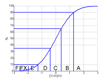 La norme européenne de l’ECTS (European Credit Transfert System) recommande la répartition suivante pour son « échelle de réussite » :