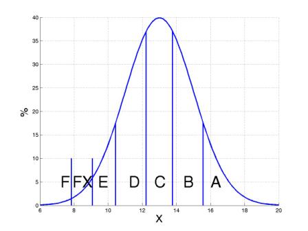 Le tableau 1 indique les seuils d’attribution des grades ECTS pour les moyennes m=12,13,14 et les écarts types s =1,2,3. Pour ce calcul, la distribution des notes est supposée gaussienne et seuils pour les grades FX et F ont été déterminés avec les pourcentages respectifs de 2.5% et 0.5%.