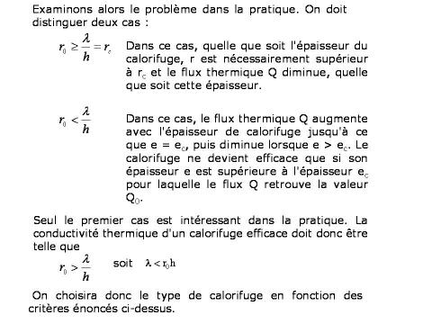 Considérons un tube métallique de rayon r0 calorifugé par un calorifuge de conductivité λ. On peut montrer qu'il existe une valeur critique du rayon du tube rc telle que si r0 < rc, le calorifugeage peut conduire à une augmentation du flux de perte thermique. Le calorifuge est alors inefficace.
