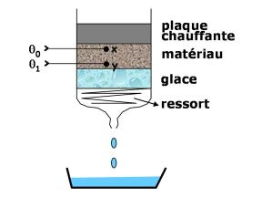 On pèse l'eau récupérée après un temps donné, ce qui permet de déterminer le flux de chaleur (correspondant à la fusion de la même masse de glace) ayant traversé le matériau. On mesure parallèlement les deux températures θ0 et θ1. On en déduit alors la conductivité du matériau :