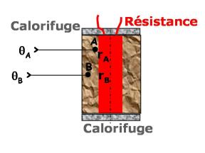On mesure les températures en deux points A et B situés à des distances rA et rB de l'axe. En régime permanent :