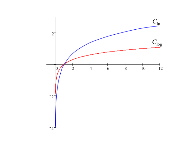 On a représenté sur le même graphique la fonction ln et la fonction log.