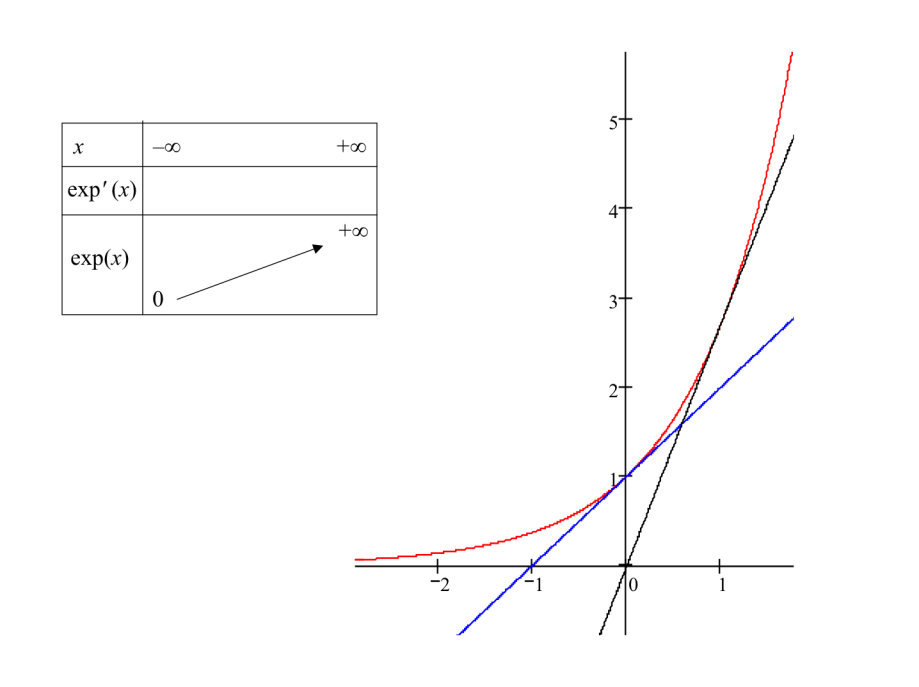 La propriété précédente nous permet de dire que la représentation graphique de la fonction exponentielle admet une asymptote d'équation (axe des abscisses), lorsque tend vers , une branche parabolique verticale (d'axe ) lorsque tend vers .