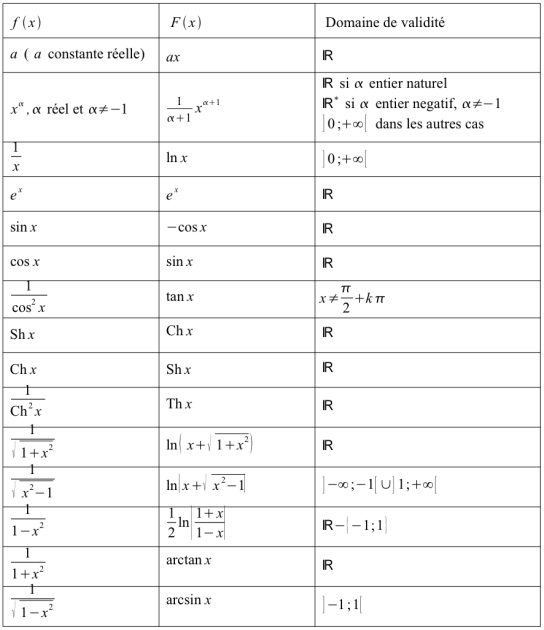 Par lecture inverse du tableau des fonctions dérivées usuelles, on obtient :