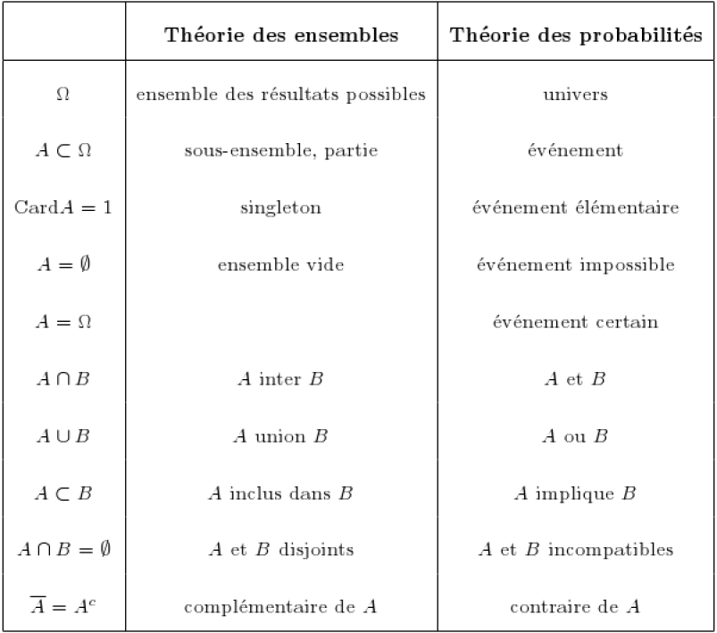 - Des évènements \(A\), \(B\) sont disjoints, ou incompatibles, si et seulement si \(A \cap B=\emptyset\).