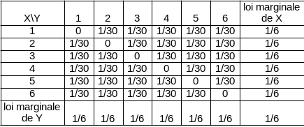 On jette un dé une première fois, le nombre porté par la face supérieure est une variable aléatoire \(X\) ; on jette à nouveau le dé jusqu'à ce que l'on obtienne un nombre différent du premier jet, le nombre obtenu est une variable aléatoire \(Y\) . On obtient ainsi un couple de variables aléatoires \((X, Y)\) défini par l'ensemble des couples \((i, j)\) avec \(i \neq j\) avec \(i\) et \(j\) dans l'ensemble \(\{1, ..., 6\}\) :