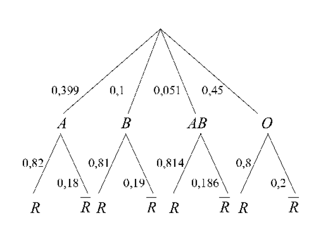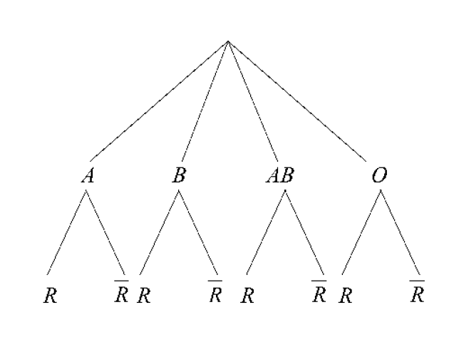 Dans notre exercice, il y a deux expériences : le groupe sanguin (quatre résultats \(A, B, AB, O\)) et le rhésus (deux résultats : positif noté \(R\) et négatif noté ) . Ces deux expériences sont clairement dépendantes. En revanche, contrairement à la plupart des expériences dépendantes, elles sont commutatives (c'est-à-dire qu'on peut supposer comme première expérience soit le groupe sanguin soit le rhésus). Nous prendrons comme première expérience le groupe sanguin. L'arbre se représente comme suit :