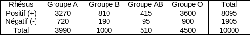 Nous avons une population de 10000 personnes. Pour chacune de ces personnes, nous avons récupéré leur groupe sanguin ainsi que leur rhésus. Ces données sont récapitulées dans le tableau suivant.