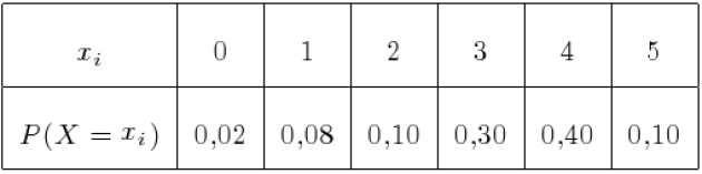 \(E(X) = 0 + 1 \times 0, 08 + 2 \times 0, 1 + 3 \times 0, 3 + 4 \times 0, 4 + 5 \times 0, 1 = 3, 28\)