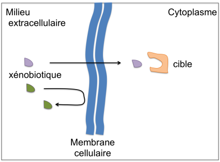 Par contre, un xénobiotique qui ne peut pas traverser les membranes cellulaires, comme le composé vert, même s'il a une forte affinité pour la cible qui se trouve à l'intérieur de la cellule, n'aura aucun effet car il ne pourra atteindre cette cible.