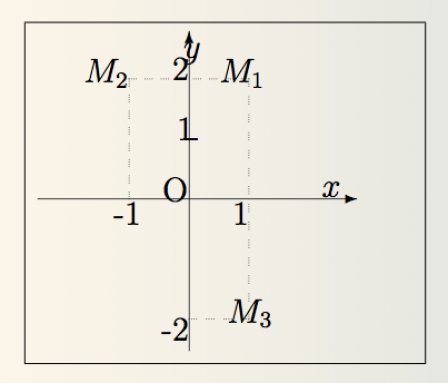 \(M_2\) : la partie réelle \(x=-1\) est l'abscisse et le coefficient \(y=2\) devant \(i\) dans la partie imaginaire est l'ordonnée.