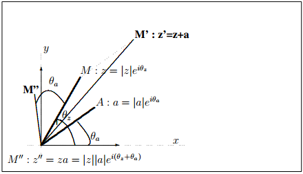 \(∀a = |a|e^{i\theta a} ∈ \mathbb{C} ∀z = |z|e^{i\theta z} ∈ \mathbb{C}\), on a alors \(az = |a||z|e^{i(\theta _a+\theta _z)}\). Donc si M” est le point d'affixe \(z'' = a z\), M” est l'image de M d'affixe \(z\) par l'homothétie de centre O et de rapport \(|a|\) et la rotation de centre O et d'angle \(Arg(a) = \theta _a\).
