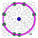 En considérant une répartition homogène des particules dans l'espace, la fonction de distribution radiale g(2)(r) = g(r) représente la probabilité de trouver une particule dans l'écorce dr à la distance r d'une autre particule comme le montre la figure ci-dessous :