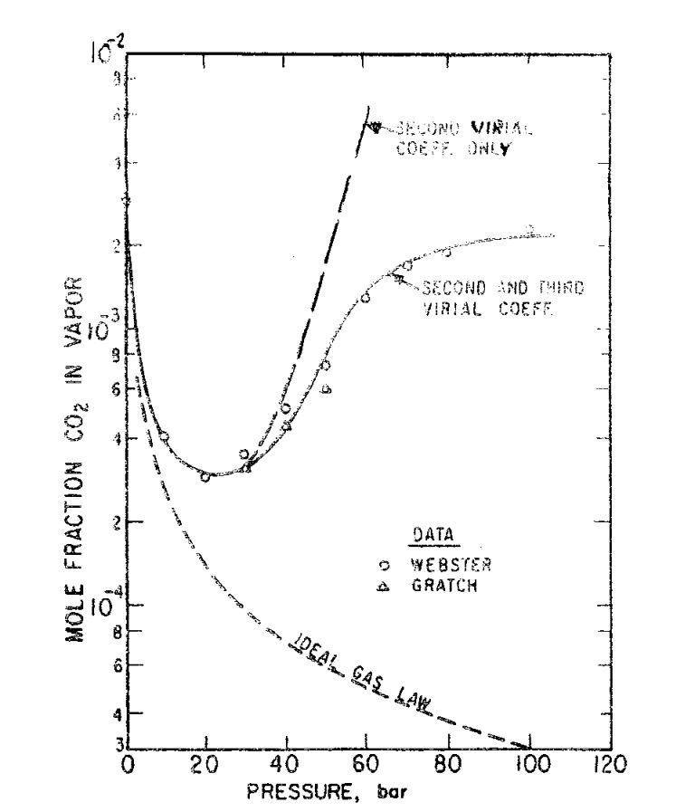 Il est préférable de ne pas tronquer : l'équation du gaz parfait (tronquée à l'ordre 1) ne prédit pas le minimum de solubilité avec la pression. La troncature au troisième ordre améliore très significativement celle au deuxième ordre pour les hautes pressions.