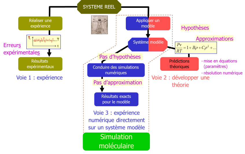 REMARQUE : Le modèle du système réel peut être le même que celui de l'approche théorique. Dans ce cas les résultats théoriques et par simulation peuvent alors être comparés directement. Ceci est très fréquemment utilisé pour tester l'efficacité d'un algorithme de simulation moléculaire.