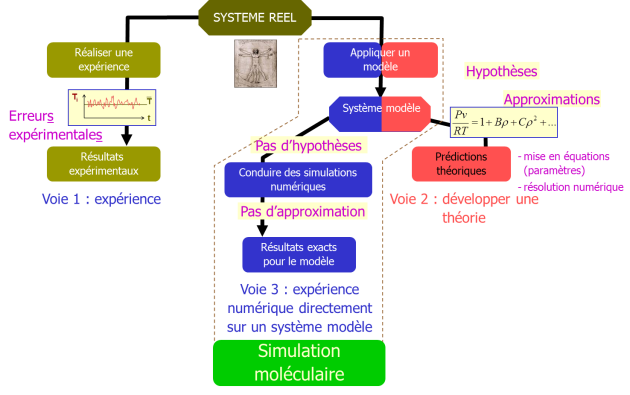Elle partage avec l'approche théorique la nécessité de définir un système modèle et les potentiels d'interactions entre ses éléments constitutifs, ainsi que l'utilisation des principes de mécanique statistique pour effectuer des moyennes d'ensemble sur un ensemble statistique.