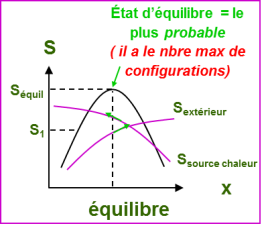 l'entropie est maximale à l'état d'équilibre car celui-ci est le plus probable, puisqu'il correspond au plus grand nombre d'états (de configurations) de même énergie.