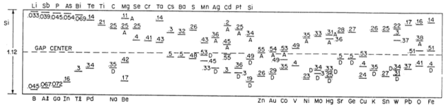 La figure ci dessous montre, à titre d'exemple, les différents niveaux extrinsèques qui apparaissent dans la bande interdite du silicium. On remarquera le nombre important de niveaux et le fait que certains corps donnent naissance à plusieurs niveaux.