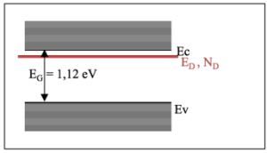 La cinétique d'ionisation des impuretés en fonction de la température, dans un semi-conducteur, est régie par la statistique de Fermi-Dirac. Par exemple, considérons du silicium dans lequel on a introduit des atomes de phosphore. Cette impureté est caractérisée par l'énergie du niveau qu'il génère (ED), et par la densité correspondante (ND en cm-3).