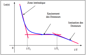 Lorsque tous les donneurs sont ionisés, la densité des porteurs reste constante tant que l'énergie n'est pas suffisante pour faire sauter des électrons de la bande de valence (EG >>EC-ED).