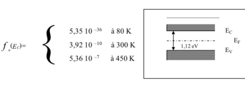 En considérant que le niveau de FERMI est situé au milieu de la bande interdite, ce que nous justifierons plus loin, on peut calculer la probabilité de présence d'un électron sur le niveau EC pour différentes températures. |