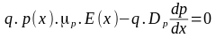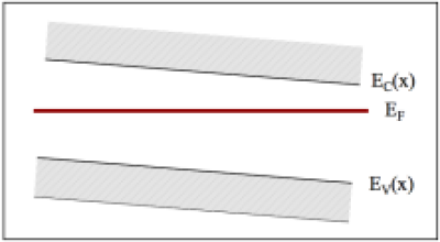 Considérons le semi-conducteur dont la structure de bande est représentée ci contre. Le matériau étant isolé et à l'équilibre thermodynamique, le courant électrique total est nul. La non homogénéité du matériau entraîne l'apparition d'un champ électrique interne. Deux phénomènes antagonistes vont exister dans la structure.