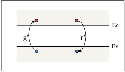 Dans un matériau semi-conducteur, les densités de porteurs existant dans les bandes sont le résultat de deux mécanismes permanents d'échange entre elles. Il s'agit de la Génération (g' en cm-3.s-1) et de la Recombinaison (r' en cm-3.s-1) . Les porteurs générés passent de la bande de valence vers celle de conduction puis effectuent le chemin inverse en se recombinant. Il existe donc un flot permanent de porteurs allant de la bande de valence vers la bande de conduction et vice et versa.