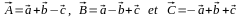 Plutôt que cette maille élémentaire, il est plus aisé de considérer la maille bâtie sur 3 vecteurs A , B , C widevec {A} , widevec {B} , widevec {C} définis par : A = a + b c , B = a b + c et C = a + b + c widevec {A} = widevec {a} + widevec {b} - widevec {c} ,~widevec {B} = widevec {a} - widevec {b} + widevec {c} ~et ~widevec {C} = -widevec {a} + widevec {b} + widevec {c}