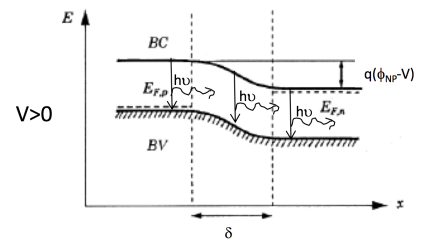 Lorsqu'une jonction PN est polarisée en direct, les électrons majoritaires de la régions N sont injectés dans la région P où ils diffusent et inversement pour les trous. S'ils n'ont pas réussi à traversé la région P assez rapidement, ils se recombinent. Une DEL[1] est une jonction PN dans laquelle les recombinaisons des porteurs excédentaires sont essentiellement radiatives.