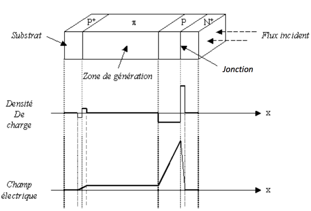 Il s'agit d'une jonction PN polarisée en inverse. A la jonction, on a une zone intrinsèque I réalisée par dopage par compensation afin de maximiser la zce[1] dans laquelle vont être collectés les porteurs photogénérés. Le courant photoélectrique issu de la photodiode est donné par: