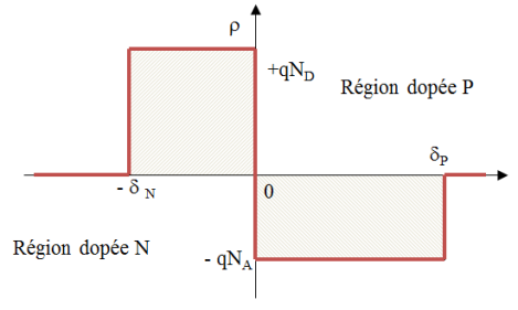 Nous allons, pour établir les équations permettant de déterminer la hauteur et la largeur de la charge d'espace, utiliser le modèle défini à partir des hypothèses de Schokley. Nous considèrerons en outre que le matériau est homogène dans le plan et de ce fait, nous utiliserons un modèle unidimensionnel. La charge électrique qui existe dans la charge d'espace correspond donc à la représentation ci-dessous.