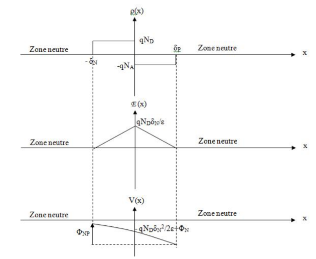 Entre la limite de charge d'espace côté N () et la position de la jonction métallurgique (), on a une charge négative de valeur constante en fonction de la distance eu égard au dopage uniforme du matériau. Cette charge vaut :