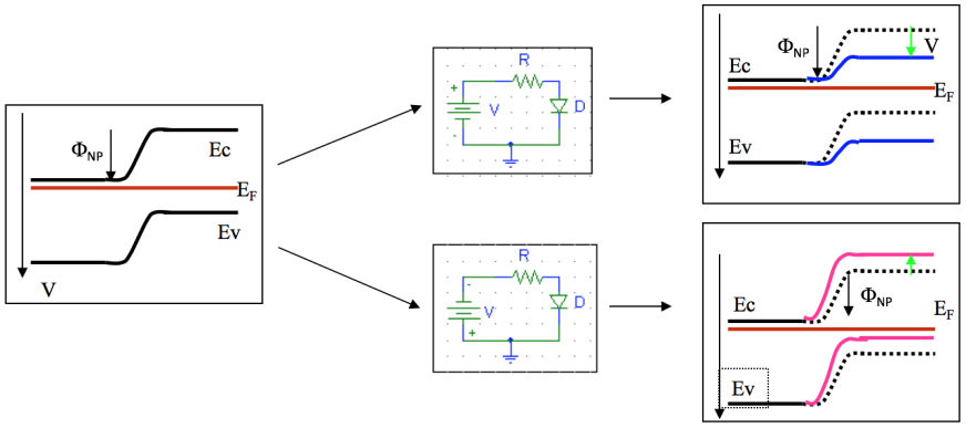 Nous allons donc représenter ci-dessous le schéma de bandes d'une diode et superposer à celui ci la tension de polarisation résultant de la source externe.