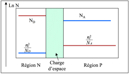 La figure ci-dessous montre la répartition des porteurs dans une jonction à l'équilibre thermodynamique en l'absence de polarisation extérieure appliquée. Les densités sont représentées en dehors de la charge d'espace.