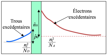 Les densités de porteurs minoritaires aux limites de la charge d'espace sont fonction de l'énergie qui elle même dépend du potentiel appliqué. Par exemple pour les électrons dans la région P à la limite de la zce[1], leur densité s'écrit : .