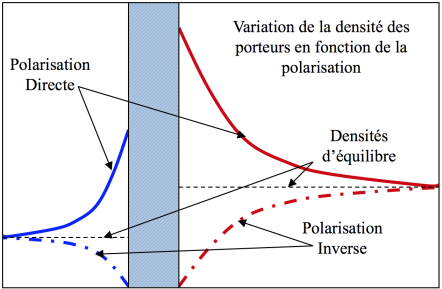 Lorsque l'on polarise, la tension se retrouve en 1ère approximation aux bornes de la zce[1] qui est un isolant. Il y a donc modification des densités de porteurs à ses limites. En effet, les densités de porteurs évoluent en exponentielle de la tension appliquée.